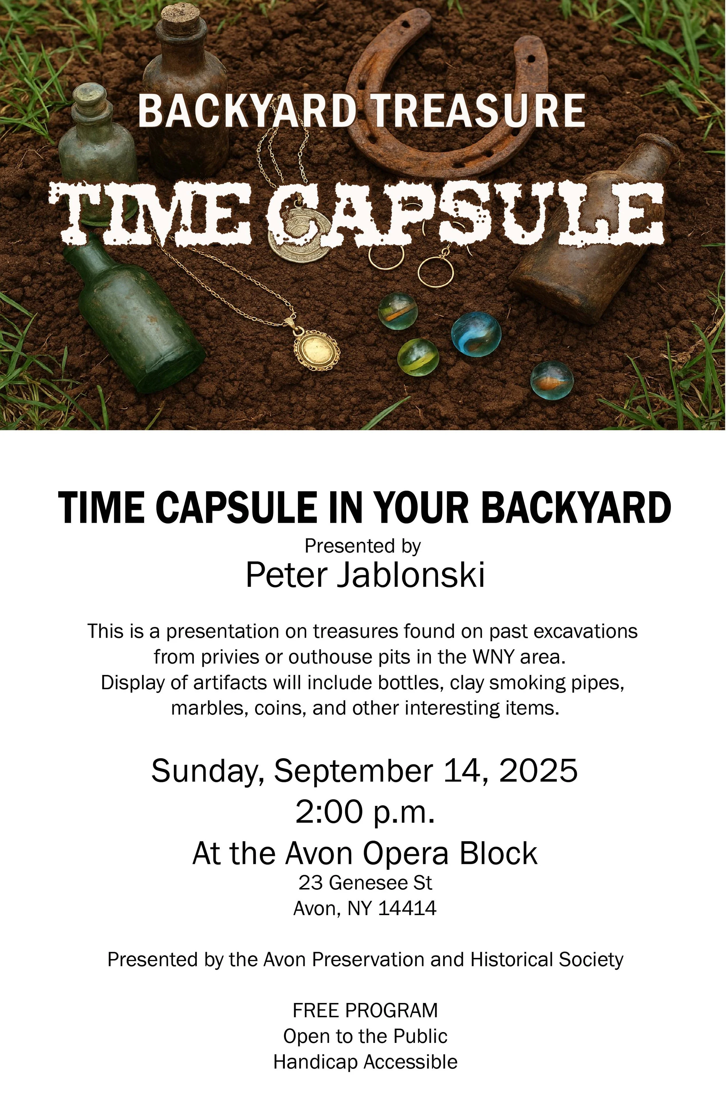 Please join us for our next program: Backyard Treasure - Time Capsule. Program will be held on Sunday, September 14 @ 2pm on the 3rd floor of the Opera Block, handicap accessible and always free.